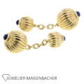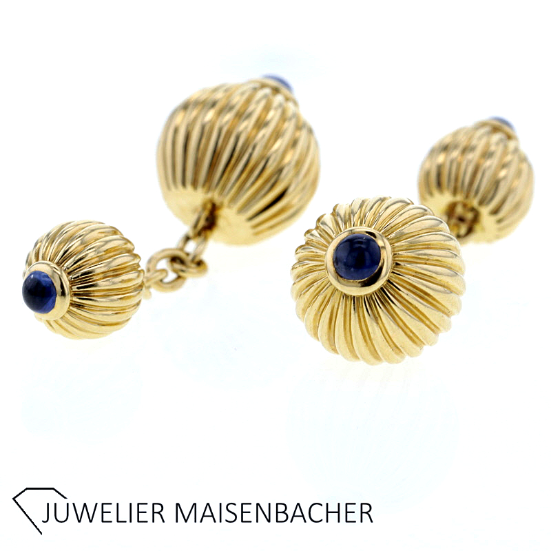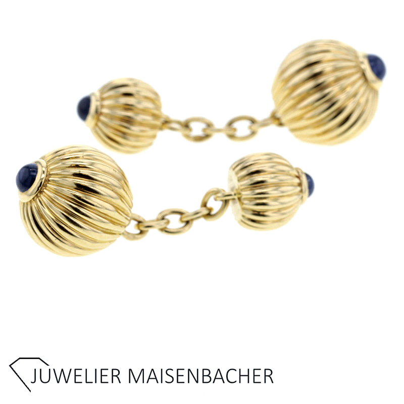 Cartier Pasha Mannschettenknöpfe mit Saphiren Vintage in 750/- Gelbgold Seriennummer: D29656 4 Saphire Cabochon insgesamt ca. 0.4 ct. 2 Kugeln gerillt je ca. 8,7 mm und 12,3 mm Durchmesser Länge: ca. 3,5 cm Bruttogesamtgewicht: ca. 13,2 Gramm Ob sportlich oder elegant, mit diesen Manschettenknöpfen sind Sie immer gut gekleidet. Mit original Zertifikat von Cartier Bei Fragen zu diesem einmaligen Schmuckstück, rufen Sie uns gerne an oder schreiben uns eine Mail