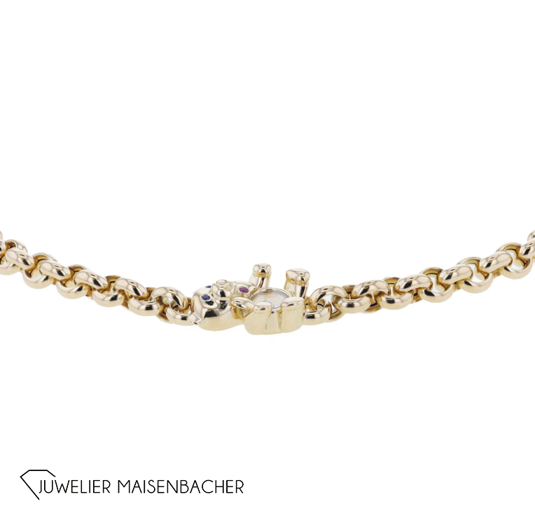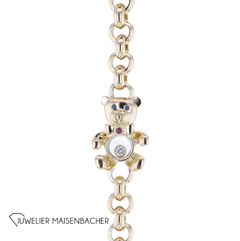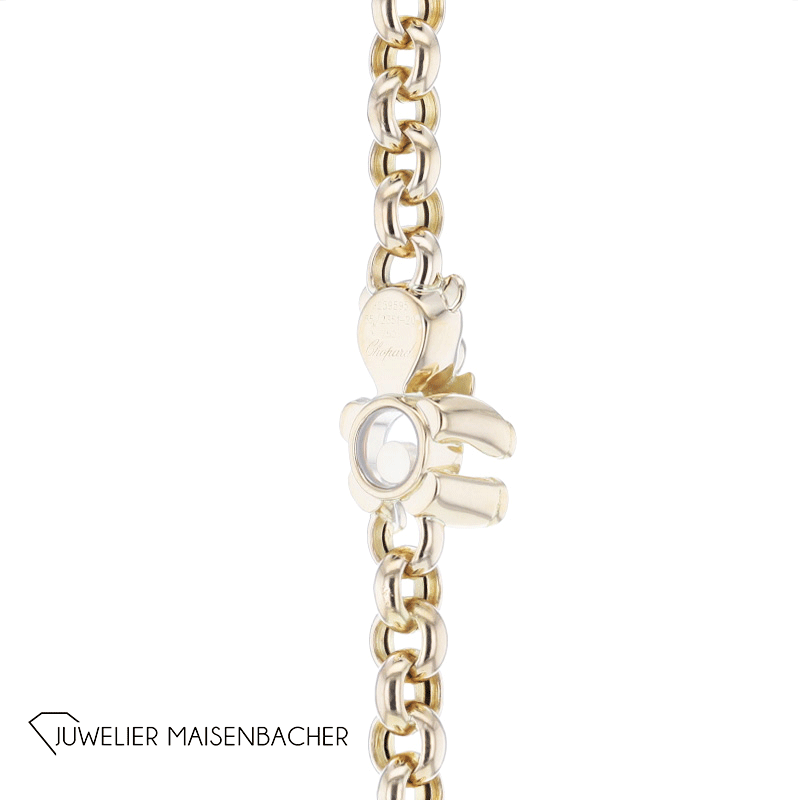Dieses außergewöhnliche Chopard Armband vereint verspieltes Design mit hochwertiger Goldschmiedekunst und sorgfältig ausgewählten Edelsteinen. Gefertigt aus edlem 750er Gelbgold, überzeugt es nicht nur durch seine warme, luxuriöse Ausstrahlung, sondern auch durch seine solide Verarbeitung und ein angenehmes Tragegefühl. Mit einer Länge von ca. 20,5 cm legt es sich geschmeidig um das Handgelenk und wirkt dabei präsent, ohne aufdringlich zu sein. Das Gesamtgewicht von etwa 17,3 g unterstreicht zusätzlich die Wertigkeit dieses Schmuckstücks.