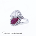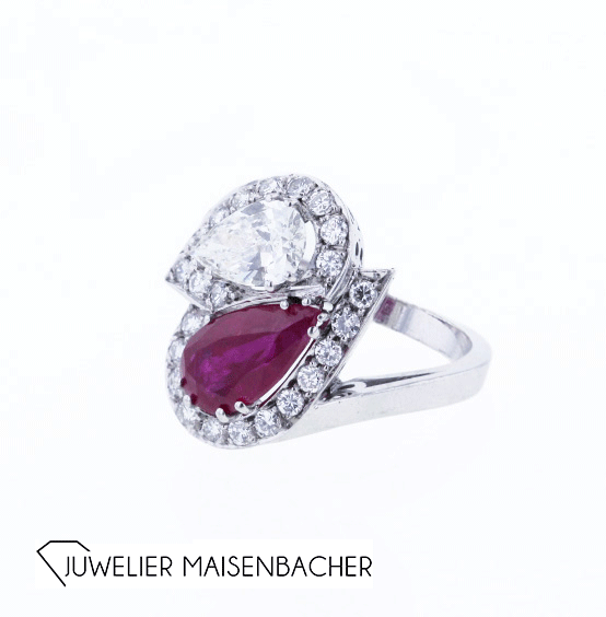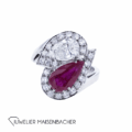 Ein prachtvoller Ring aus 950er Platin, der mit seiner Kombination aus großem Tropfendiamanten, intensiv rotem Rubin und funkelnden Brillanten ein echtes Highlight jeder Schmucksammlung darstellt.