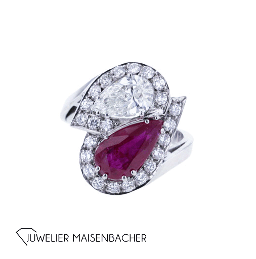 Die beiden großen Tropfensteine sind in einem raffiniert geschwungenen Ringkopf arrangiert, der ihre Formen kunstvoll aufnimmt und elegant miteinander verbindet. Umrahmt wird das Design von insgesamt 23 natürlichen Diamanten im Brillantschliff mit einem Gesamtgewicht von ca. 0,46 Carat. Diese feinen Begleitdiamanten besitzen die Farbe Wesselton Weiß (H) und eine Reinheit von VS. Durch ihre helle, klare Erscheinung und den präzisen Brillantschliff sorgen sie für zusätzliches Feuer und einen funkelnden Akzent, der den Rubin und den großen Tropfendiamanten wunderschön betont. Der funkelnde Diamantbesatz verleiht dem Ring eine luxuriöse Leuchtkraft und sorgt dafür, dass das gesamte Schmuckstück bei jeder Bewegung lebendig schimmert.