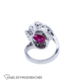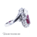 Besonders reizvoll ist bei diesem Ring das Zusammenspiel aus dem kühlen, edlen Glanz des Platins, dem strahlenden Weiß der Diamanten und dem intensiven Rot des Rubins. Diese klassische und zugleich äußerst wirkungsvolle Farbkombination verleiht dem Ring eine exklusive, zeitlose Schönheit. Der Entwurf wirkt feminin, glamourös und zugleich stilvoll anspruchsvoll — ein Schmuckstück für Liebhaberinnen besonderer Edelsteine und hochwertiger Handwerkskunst.