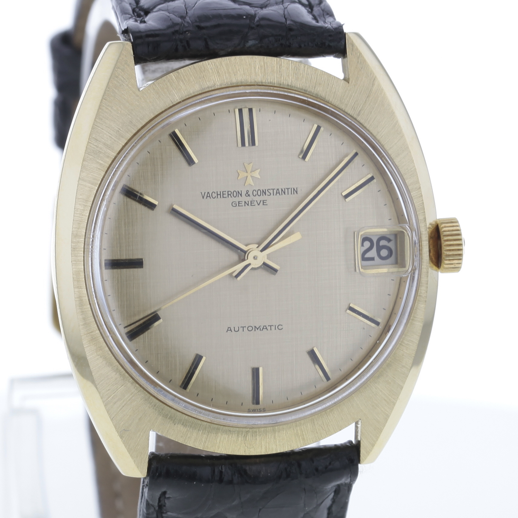 Das Zifferblatt zeigt sich in einem goldigen Ton, der die exklusive Silhouette der Uhr harmonisch unterstreicht. Die Lünette besteht ebenfalls aus Gelbgold, was dem Gesamtbild eine durchgängige Materialqualität verleiht. Das Armband aus Kroko ist in Schwarz gehalten und setzt einen kontrastreichen Akzent, der die Uhrzeitablesung erleichtert. Die Stegbreite beträgt 19 mm, während die Dornschließe aus Edelstahl, vergoldet, eine sichere und stilvolle Verschlusslösung bietet.